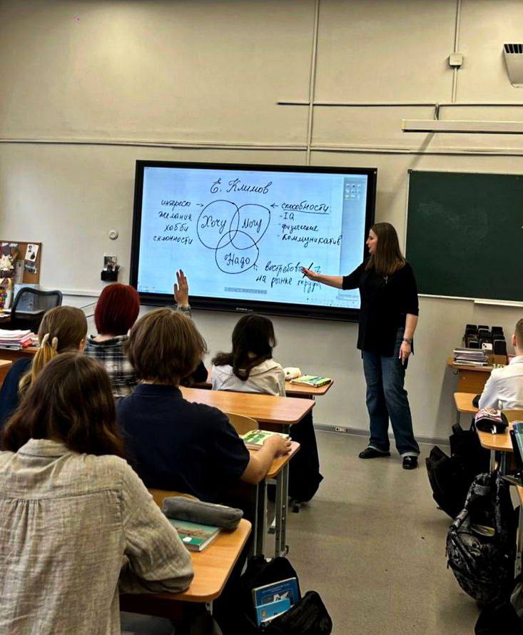В рамках Недели психологии педагог‑психолог Е. Е. Новик, совместно с классными руководителями А. С. Умеренковой и Е. Г. Федоровой, провела для восьмиклассников серию профориентационных классных часов